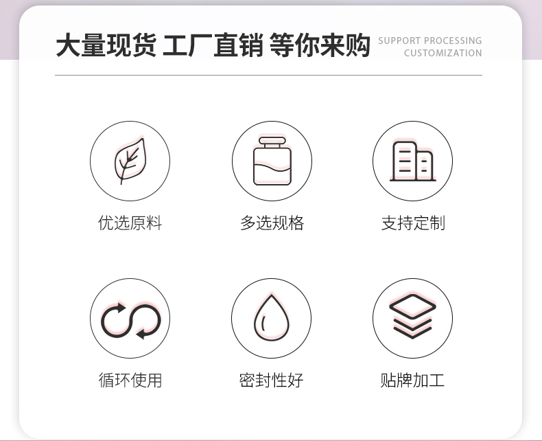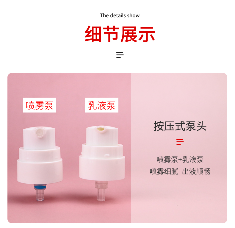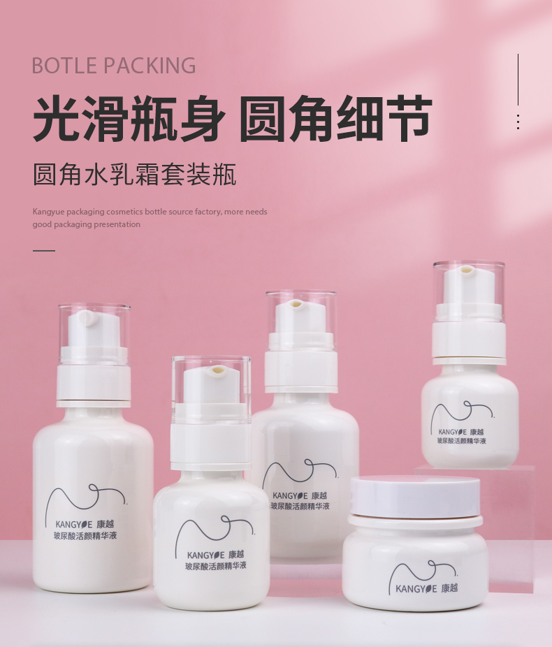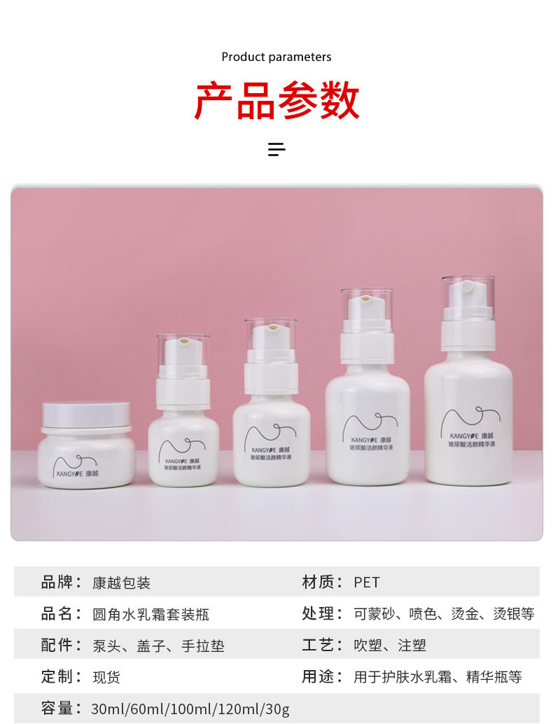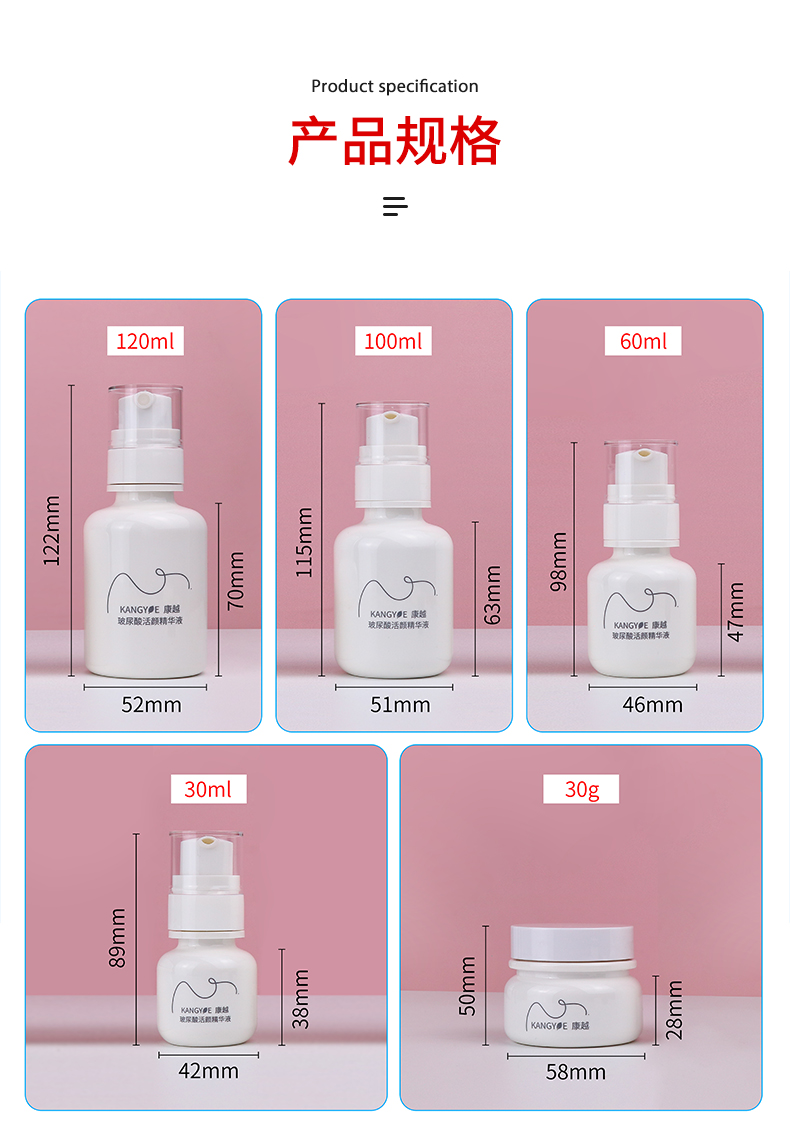 容量 30ml乳液瓶,60ml乳液瓶,100ml乳液瓶,120ml乳液瓶,30ml噴霧瓶,60ml噴霧瓶,100ml噴霧瓶,120ml噴霧瓶,30g單層膏霜瓶,50g單層膏霜瓶,55-30g雙層膏霜瓶
