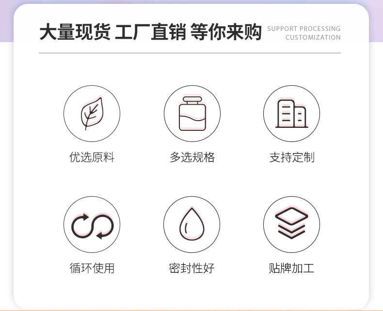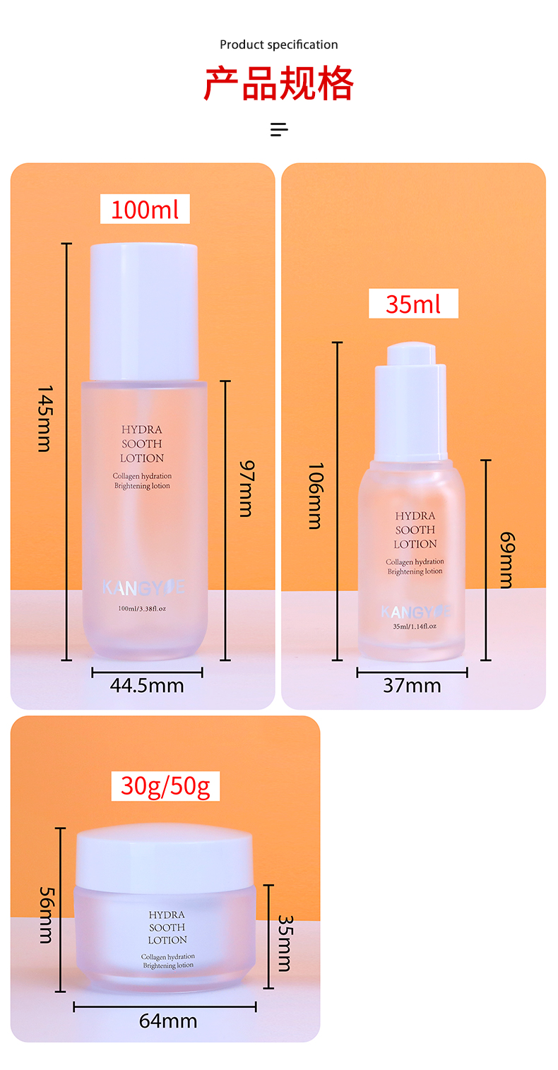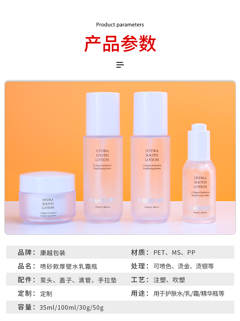 容量 100ml乳液瓶,100ml噴霧瓶,30ml滴管瓶,30g雙層膏霜瓶,50g雙層膏霜瓶