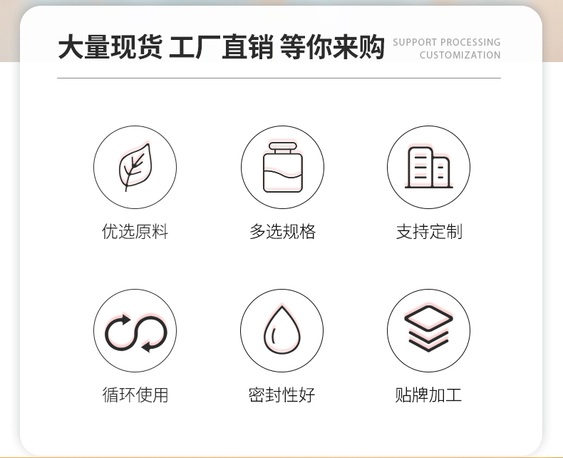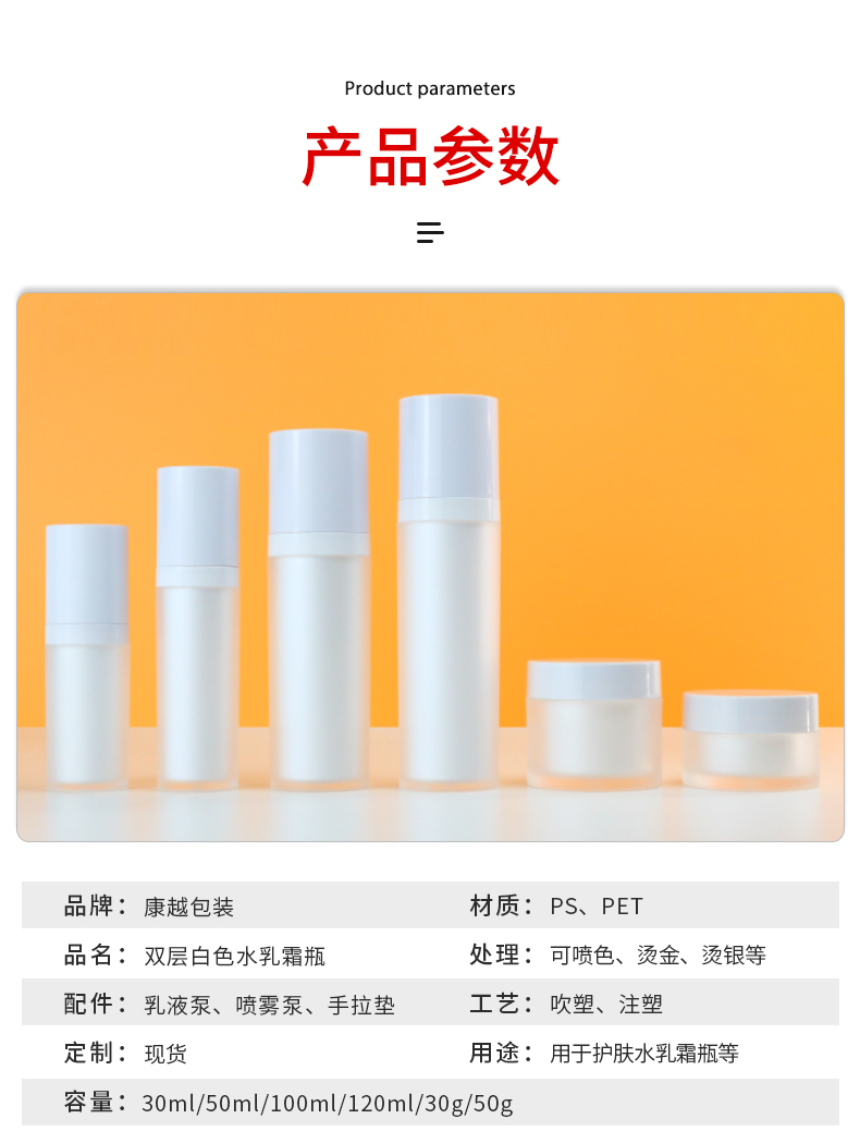 容量 30ml乳液瓶,50ml乳液瓶,100ml乳液瓶,120ml乳液瓶,30ml噴霧瓶,50ml噴霧瓶,100ml噴霧瓶,120ml噴霧瓶,30g膏霜瓶,50g膏霜瓶